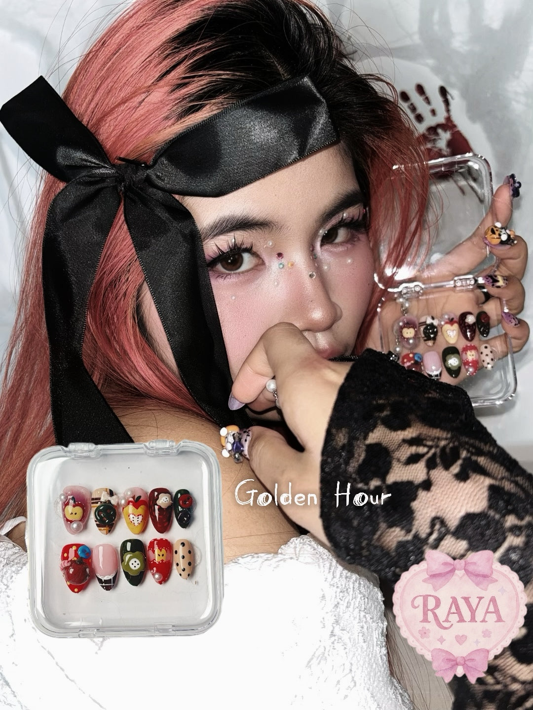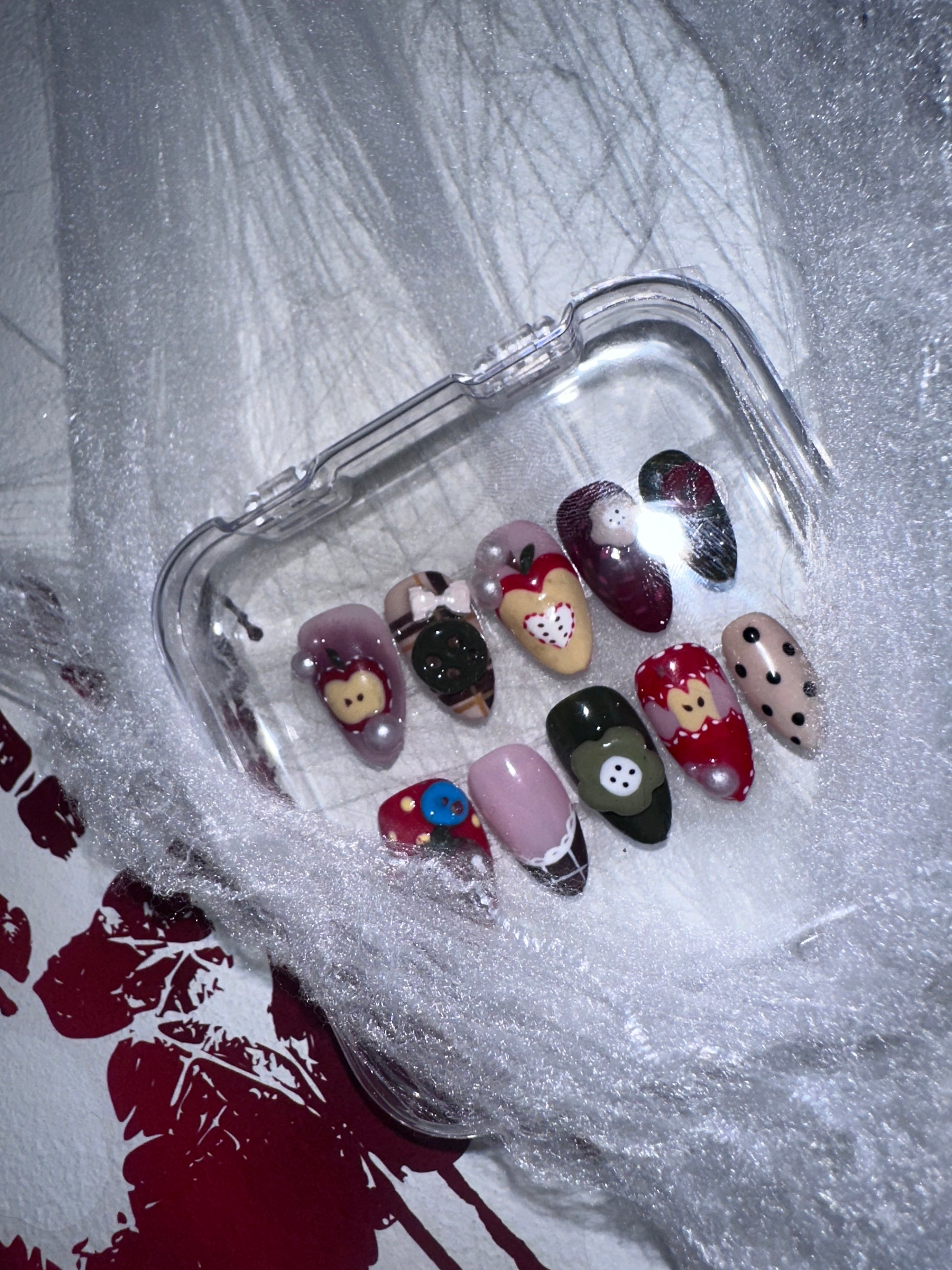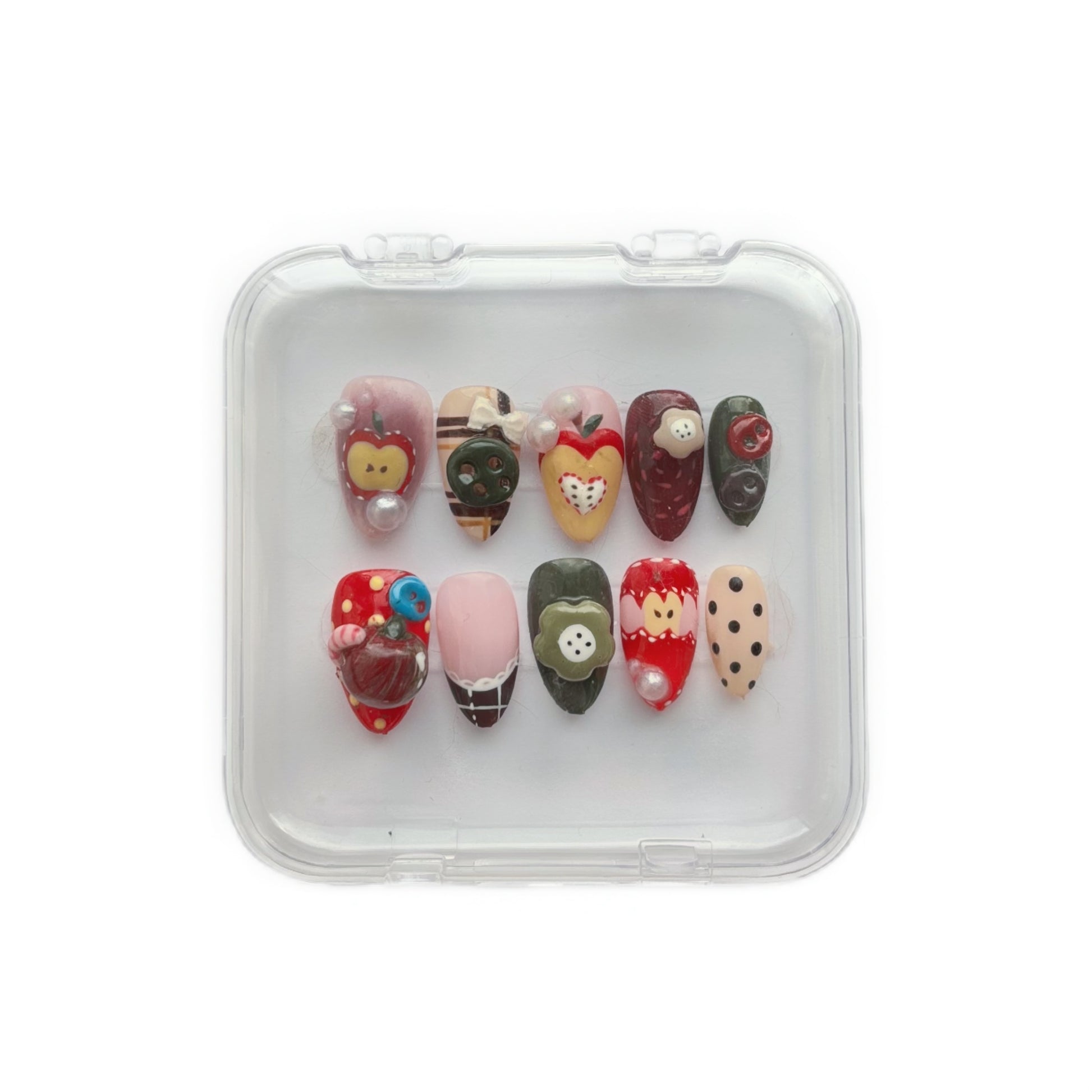 Comes in a clear organiser case for storing the nails, and all complimentary tools necessary for wearing the design – sticky tabs x 24 pcs in 12 sizes, 2g nail glue x 1, cuticle tool x 1, dehydrating wipe x 1, nail file x 1.